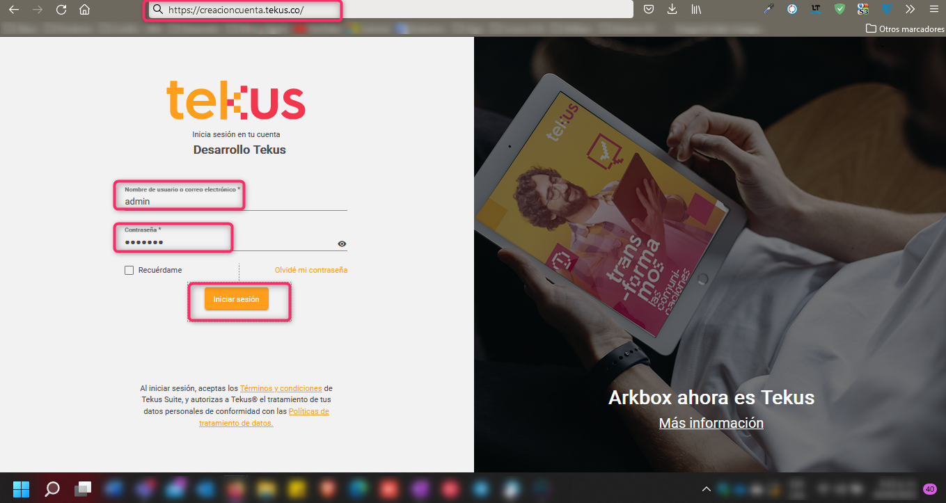 En el navegador de tu preferencia debes ingresar el dominio que creó Tekus para ti o para tu empresa de la siguiente manera https://dominio.tekus.co . Recuerda remplazar la palabra dominio por el nombre de la compañía, las iniciales o según la variación atribuida en el momento del registro.