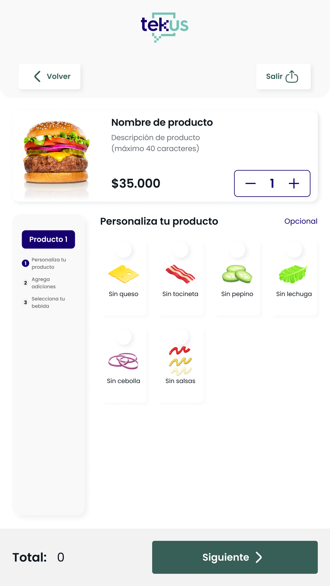 Se abrirá la pantalla de detalles, donde podrás personalizarlo según las opciones disponibles (tamaño, ingredientes adicionales o eliminaciones).