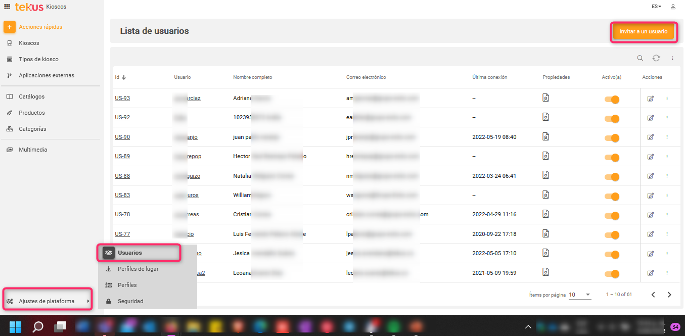 Para continuar con el mismo ejemplo de ese artículo nosotros vamos a ingresar al dominio creacioncuenta.tekus..co, pero recuerda que tú debes ingresar al tuyo o al de tu empresa.A continuación, en el menú lateral, debes hacer clic en Ajustes de plataforma > seleccionar Usuarios > y hacer clic en Invitar a un usuario.