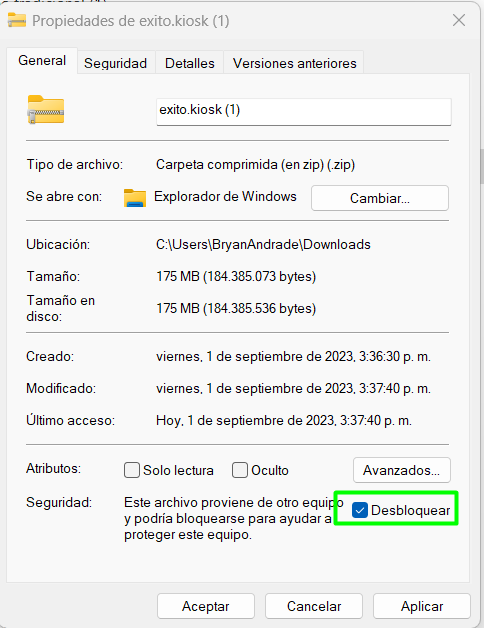 Ahora debes ir a la carpeta Descargas del kiosco > hacer clic derecho sobre cada archivo que acabas de descargar > Propiedades > Activar Desbloquear