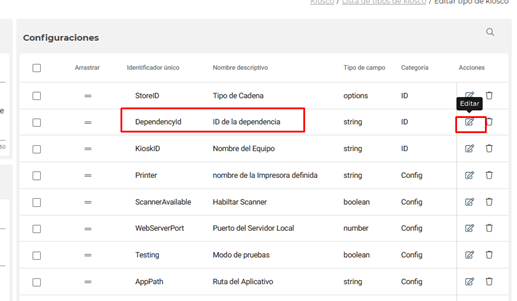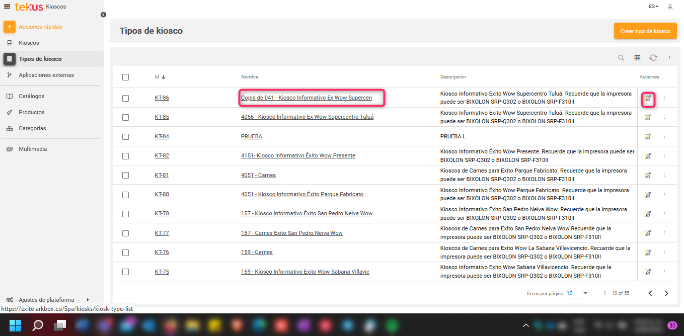 Ahora debes Ingresar en el Tipo de kiosco que acabas de clonar haciendo clic en el nombre o en el cuadro Editar que está a su derecha.