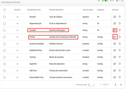 Ahora volviendo a las configuraciones, debes ir a KioskID y Printer seleccionando el botón de Editar de cada una, y en Información por defecto debes borrar lo que haya en el campo, dejarlo en blanco y hacer clic en Guardar.