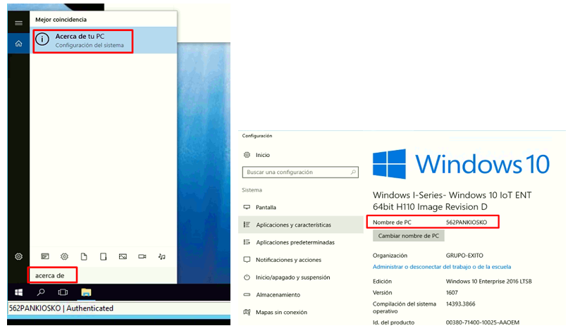 Nombre: debes especificar el nombre del kiosco tal cual aparece en el equipo y sin espacios. Para saberlo debes abrir el kiosco, dirijirte a la lupa de la barra de tareas, y abrir Acerca de.