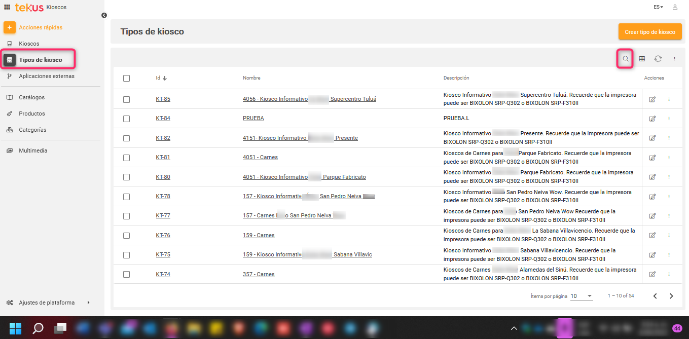 Ahora, en el menú lateral debes seleccionar Tipos de Kiosco > hacer clic en la lupa (Buscar) > escribir la dependencia del kiosco a instalar para ver si el tipo de kiosco ya existe > y presionar Enter.