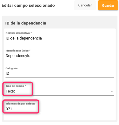 Una vez dentro de la configuración anterior en Tipo de campo debes seleccioanr Texto y en Información por defecto debes escribir el código de la dependencia (con un cero por delante si la dependencia es de 3 dígitos) y hacer clic en Guardar.