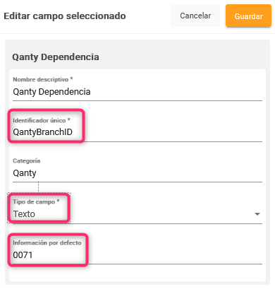 Luego, en Tipo de campo debes seleccionar Texto y en Información por defecto debes escribir el código de la dependencia y hacer clic en guardar.