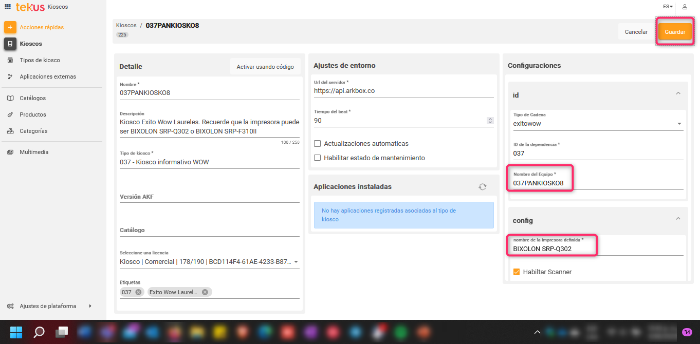 Configuración y registro del kiosco en plataforma