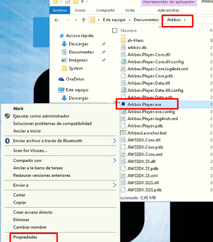 Debes ingresar a la carpeta Documentos del kiosco > hacer doble clic en la carpeta Arkbox > hacer clic derecho en el archivo Arkbox.Player.exe > y seleccionar propiedades