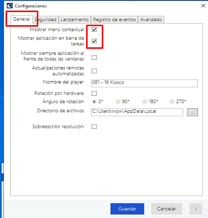 Debes seleccionar la pestaña General y habilitar Mostrar menú contextual y Mostrar aplicación en barra de tareas.