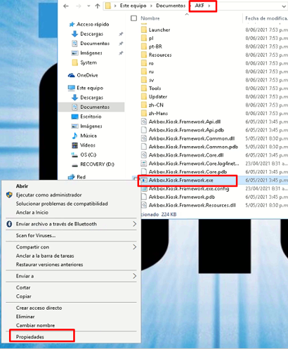 Debes hacer clic derecho en el archivo Arkbox.Kiosk.Framework.exe y seleccionar propiedades