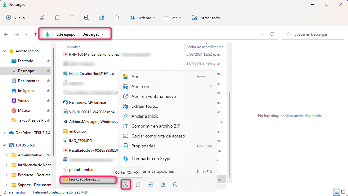 Si deseas acceder a todas las versiones existentes de la App de Kiosco La Colonia ingresa a: https://cdn.tekus.co/LaColonia/Versions/Ahora debes ir a la carpeta Descargas del kiosco > hacer clic derecho sobre el archivo que acabas de descargar (kioskLaColonia.zip) > seleccionar Cortar