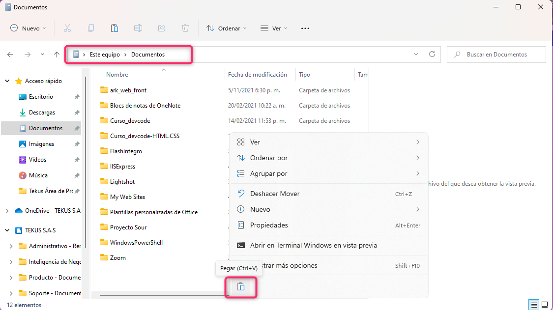Luego debes ir a la carpeta Documentos del kiosco > Hacer clic derecho sobre cualquier lugar de vacío de la carpeta y seleccionar Pegar