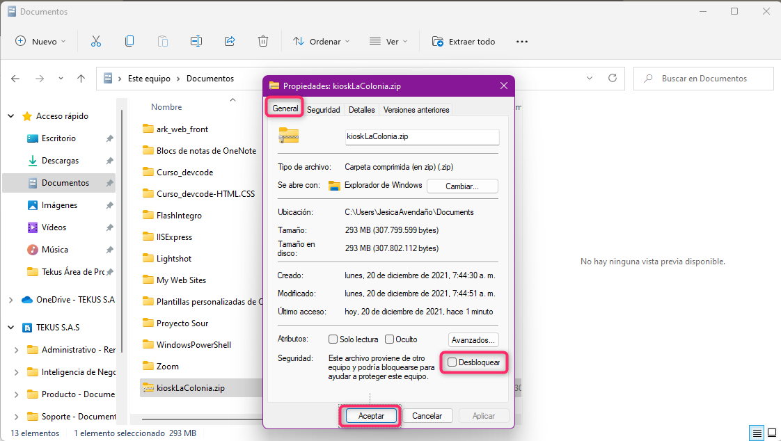 Una vez tengas el archivo en Documentos debes hacer clic derecho sobre kioskLaColonia.zip y seleccionar propiedades > seleccionar la pestaña General > habilitar la casilla Desbloquear de la parte inferior > y luego hacer clic en Aceptar.