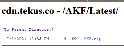 Ahora debes descargar el .zip de AKF, para esto debes ingresar en el navegador del kiosco el enlace https://cdn.tekus.co/AKF/Latest/ y seleccionar AKF.