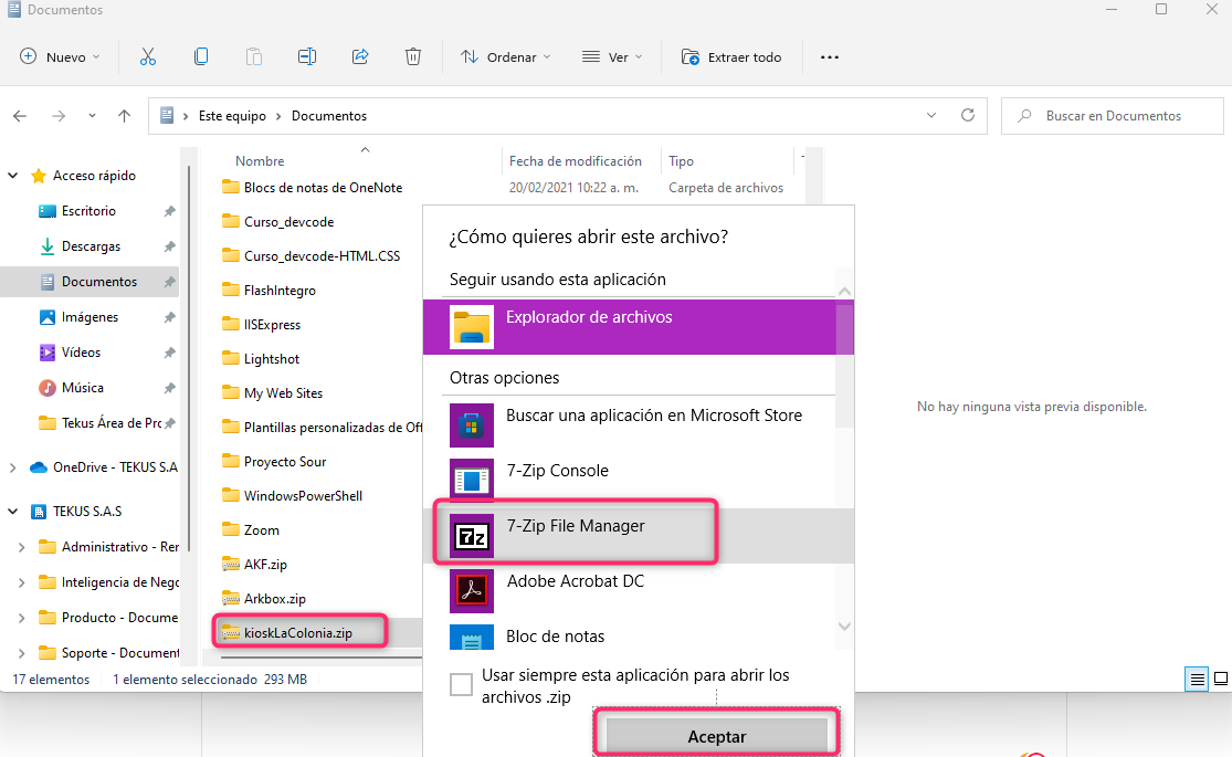 Además, estando en la carpeta Documentos, debes hacer clic derecho sobre kioskLaColonia.zip > seleccionar Abrir con > seleccionar 7-zip File Manager (este programa ya debe estar instalado en el kiosco).