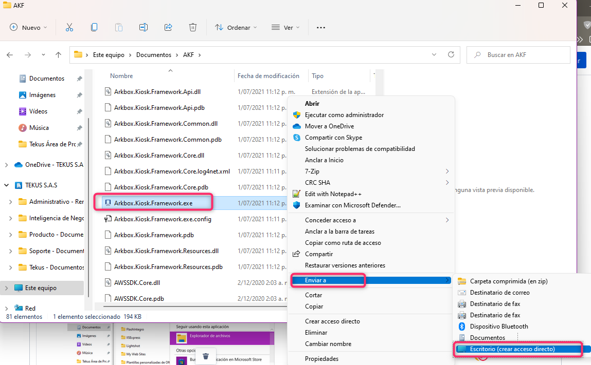 En la carpeta Documentos vas a encontrar ahora la carpeta AKF, en ella debes hacer clic derecho sobre el archivo Arkbox.Kiosk.Framework.exe > seleccionar Enviar a > seleccionar Escritorio (Enviar acceso directo).