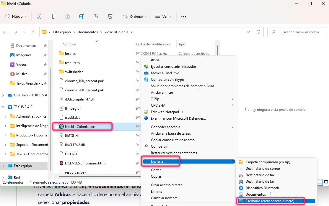 Nuevamente debes hacer clic derecho sobre el archivo kioskLaColonia.exe > seleccionar Enviar a > y seleccionar Escritorio (crear acceso directo).