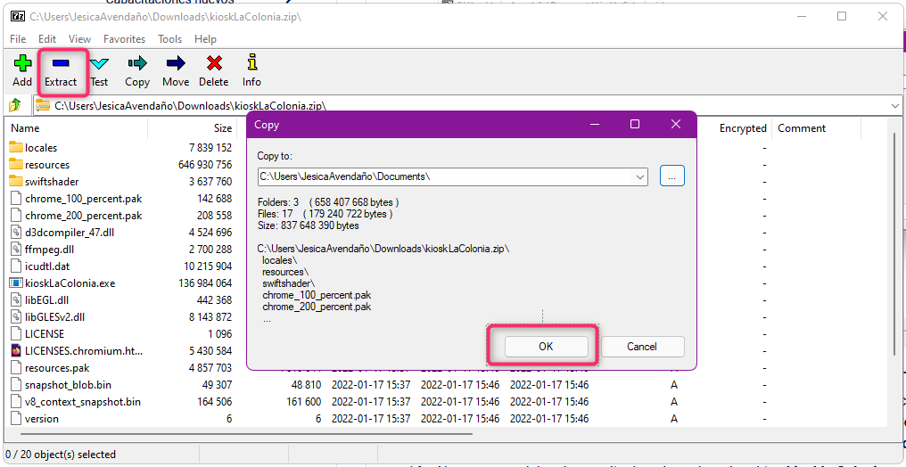 En 7zip debes hacer clic en Extract > hacer clic en Ok > y finalizar cerrando 7zip.