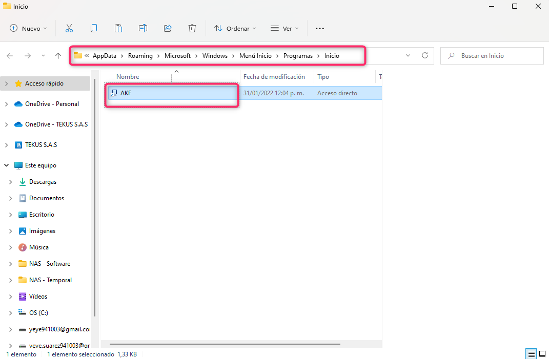 Identifica el acceso directo de AKF (renombrado como AKF) que está en el escritorio del kiosco > luego debes Copiar y Pegar dentro de la carpeta de Inicio del paso 3.