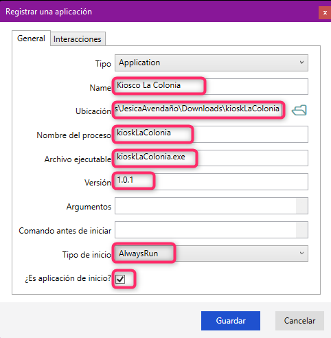 Archivo ejecutable: debes escribir kioskLaColonia.exe (Sin espacios de más ni al inicio ni al final)
