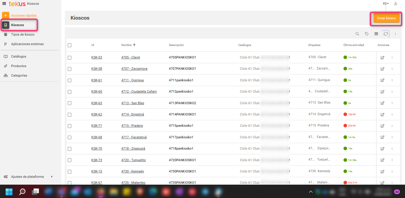 A continuación, en el menú izquierdo debes ir a la pestaña Kioscos y hacer clic en Crear kiosco.