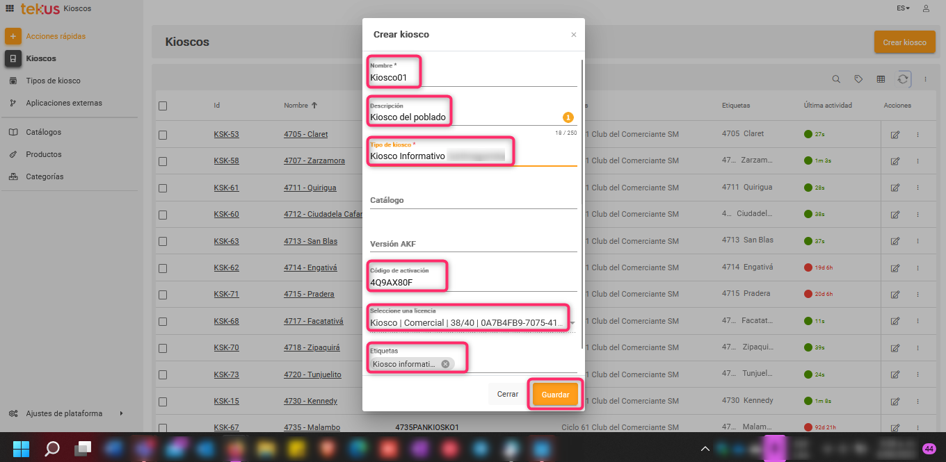 Código de activación: debes ingresar el código alfanumérico que muestra el akf instalado en el kiosco.