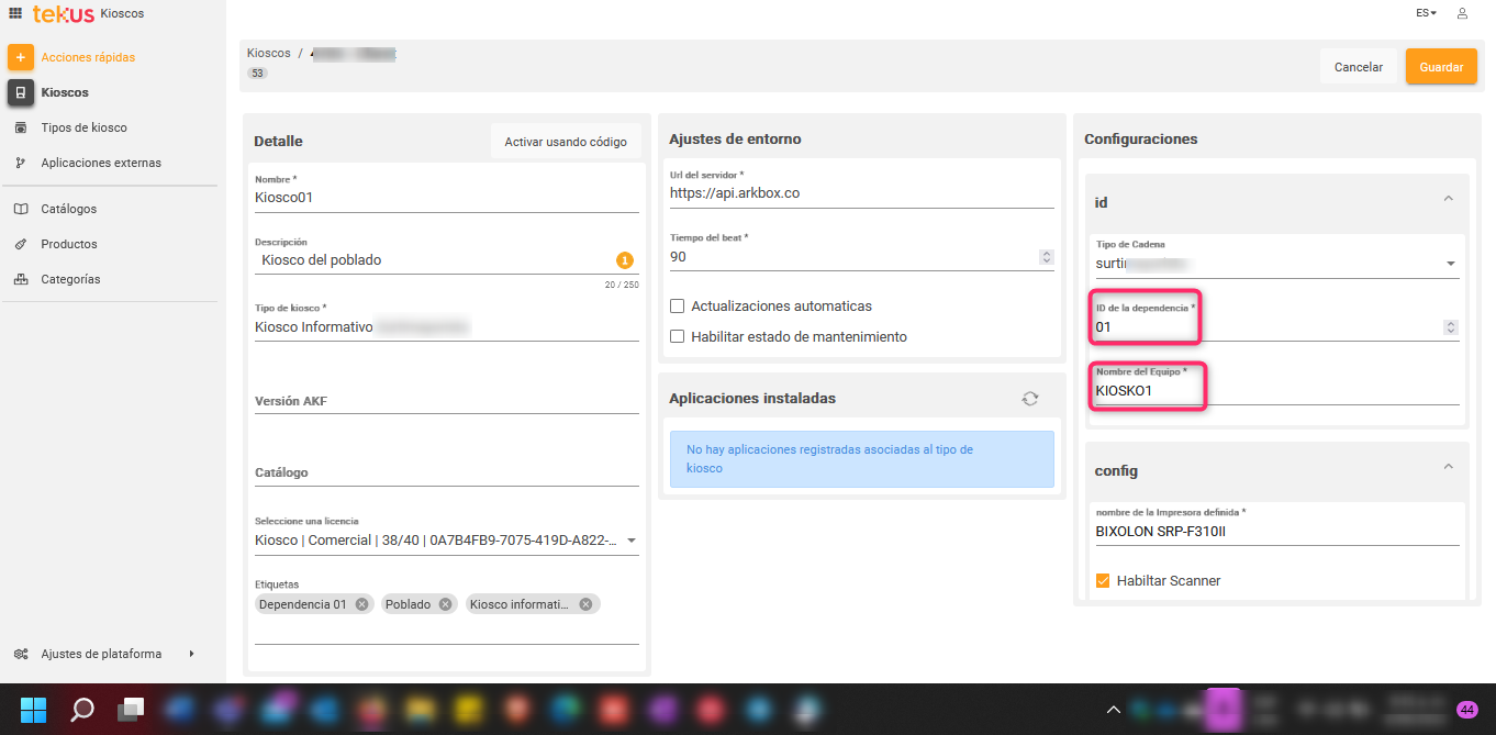 Una vez estés dentro del kiosco, en la sección Id de Configuraciones que te aparece a la derecha, debes modificar los siguientes campos cada que hagas cualquier registro dentro de akf: