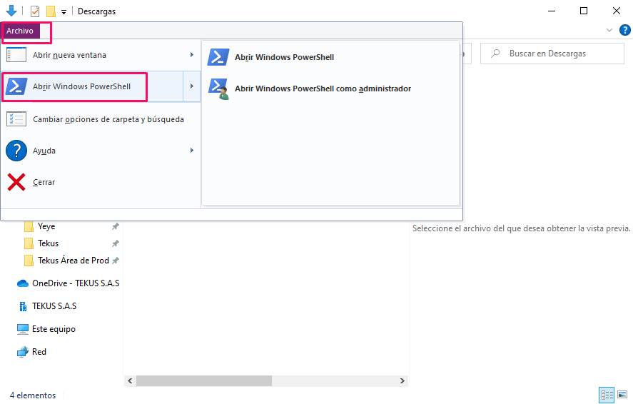 --> En la carpeta de Descargas debes hacer clic en Archivo > Abrir Windows PowerShell.