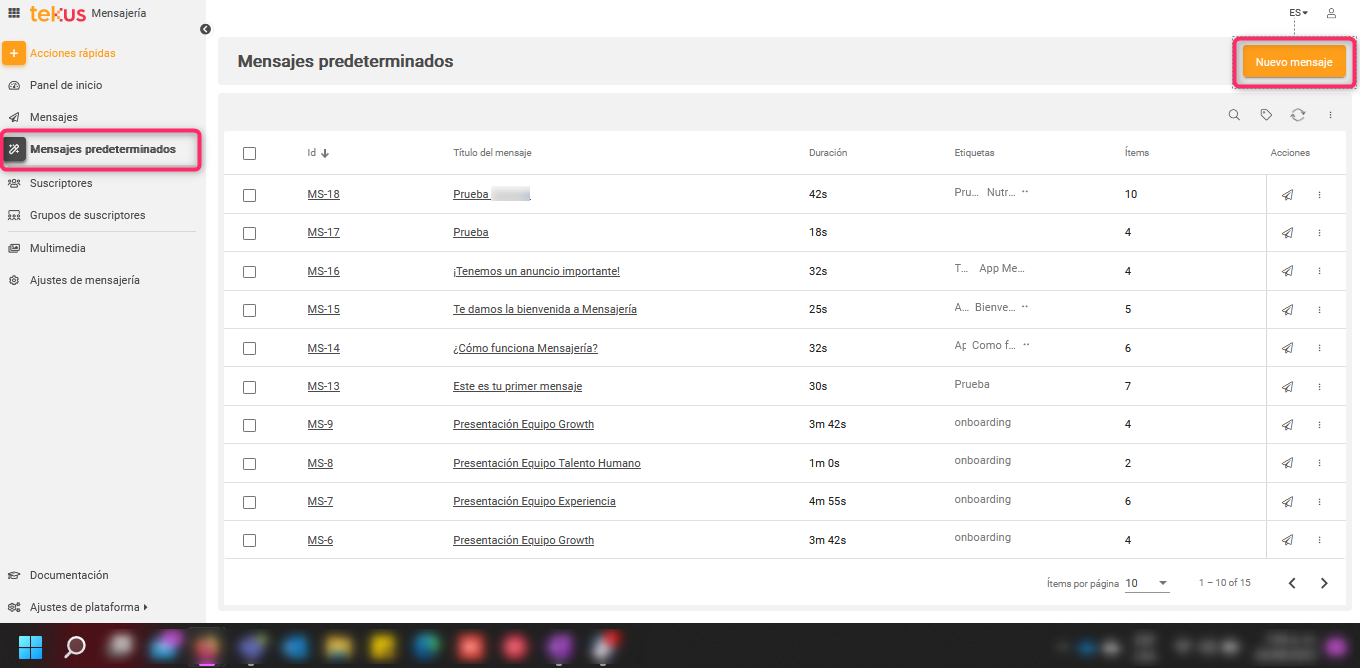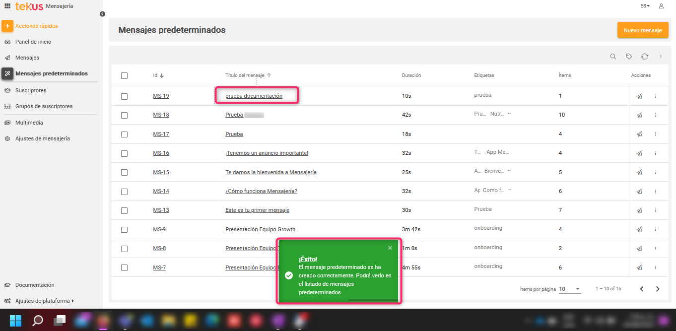 Una vez definido lo anterior, debes hacer clic en Guardar. De esta manera te aparecerá el aviso de Creación satisfactoria y serás redireccionado al listado de Mensajes predeterminados que tengas actualmente.
