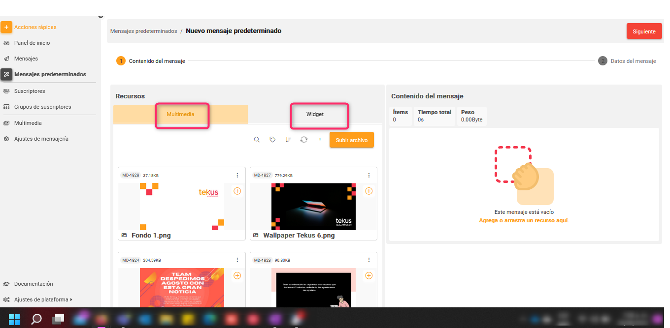 En la sección de Contenido del mensaje, dentro de Recursos debes hacer clic en la pestaña Multimedia si tu contenido corresponde a imágenes o videos, o, por el contrario, hacer clic en la pestaña Widget si deseas enviar solo texto o redirigir a una página web por medio de contenedor web.