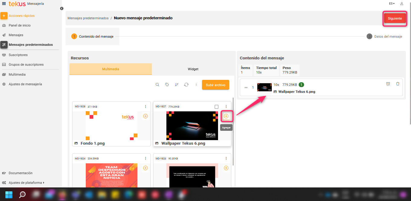 Recuerda que debes añadir tus recursos al contenido del mensaje haciendo clic sobre el ícono + que tiene cada ítem, y una vez finalices, debes hacer clic en Siguiente.