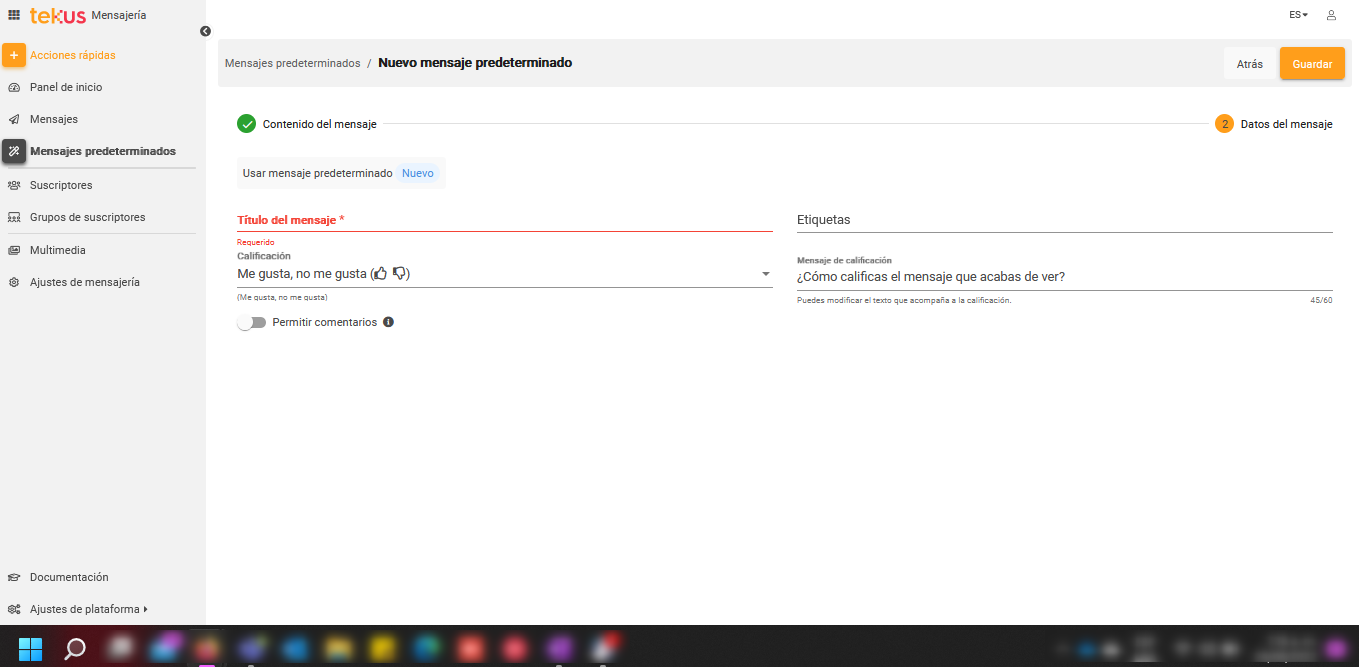 Un mensaje predeterminado es un mensaje que incluye configuraciones predefinidas en el título, la manera en la que será calificado, y el contenido (Multimedia o Widget) que llevará.