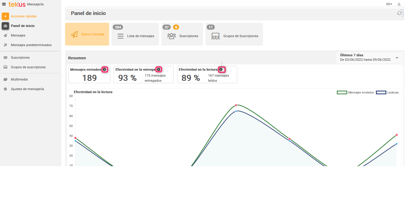 En nuestro panel de inicio vas a encontrar métricas que te ayudarán a entender de manera rápida el comportamiento de tus mensajes a través de un resumen gráfico y porcentual de la efectividad en cuanto a envíos, entregas y lecturas de los mismos.