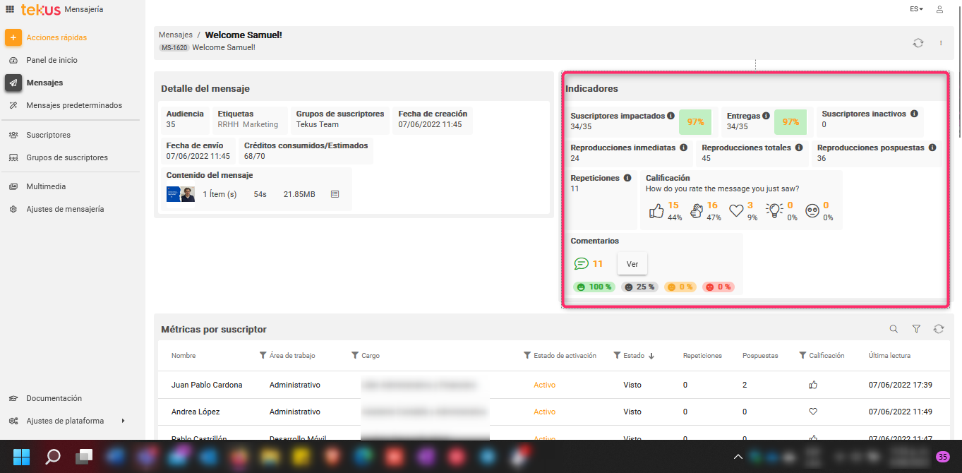 Existen dos secciones principales donde vas a poder acceder a las métricas: en el panel de inicio o Dashboard y en el detalle de cada mensaje.