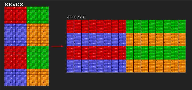 Actualmente, sabes que la resolución de tus monitores es de 720 x 1280 píxeles, pero para hallar la resolución física debes multiplicar 720 píxeles x 4, dando por resultado 2880 y mantienes la resolución vertical en la original que es 1280.