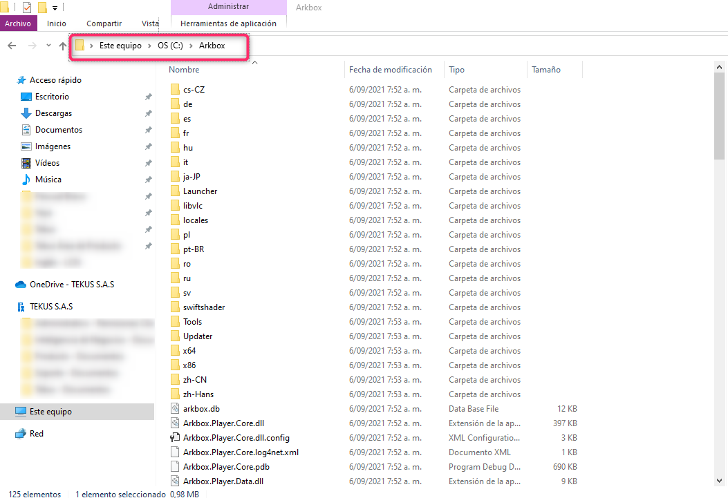 Si la carpeta descomprimida no se abre automáticamente, debes ir a Menú de inicio > Este equipo > Disco C > Arkbox