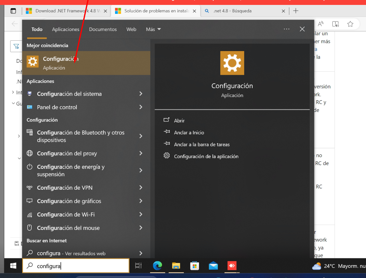 1- Escribir en la barra de búsqueda de Windows Configuración y acceder a ella: