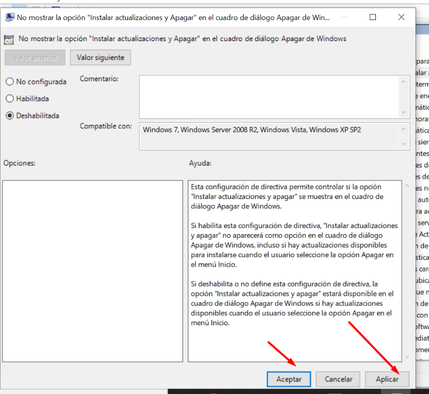 8- Seleccionar la opción de deshabilitar y darle a valor siguiente.